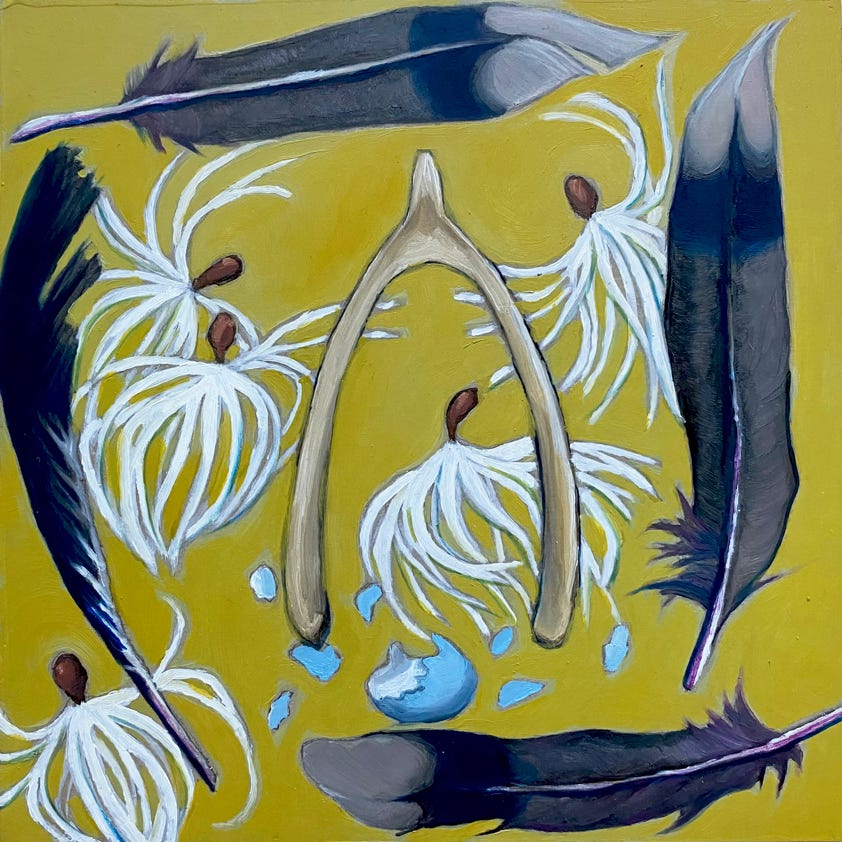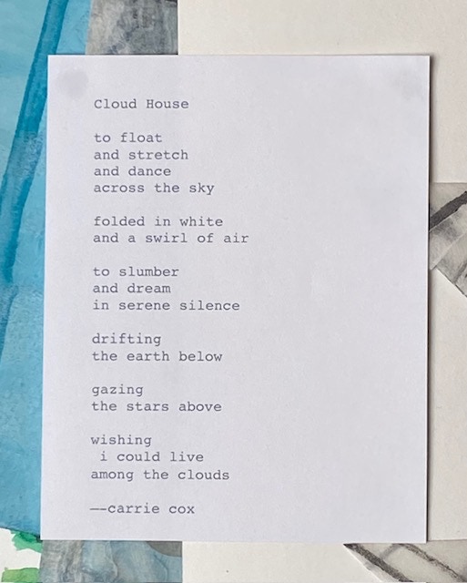 Upon moving to Asheville with her husband, Brian, in 2017, Carrie committed herself to be a full-time artist. At that time, she had been living with a cancer diagnosis for over a year, which I later learned was a catalyst to live the rest of her time making and sharing her art. Carrie shifted from printmaking to mixed media, including paper, collage, dyes, painting, found objects, and bookmaking. Carrie passed away in March this year, leaving behind stacks of works in progress. For this show, each artist from the Wedge Studio artist community chose pieces from her unfinished work to complete as a collaboration.