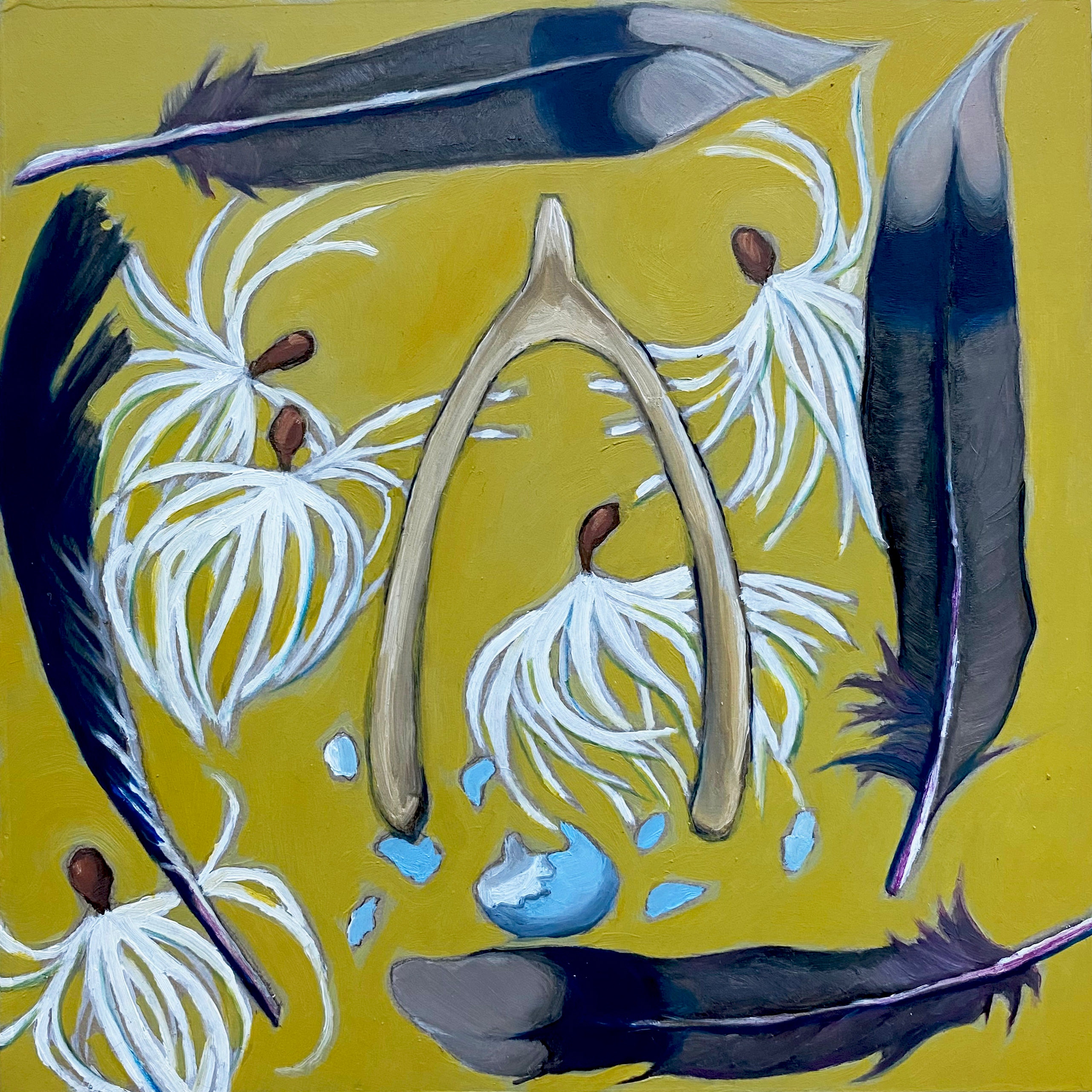 Upon moving to Asheville with her husband, Brian, in 2017, Carrie committed herself to be a full-time artist. At that time, she had been living with a cancer diagnosis for over a year, which I later learned was a catalyst to live the rest of her time making and sharing her art. Carrie shifted from printmaking to mixed media, including paper, collage, dyes, painting, found objects, and bookmaking. Carrie passed away in March this year, leaving behind stacks of works in progress. For this show, each artist from the Wedge Studio artist community chose pieces from her unfinished work to complete as a collaboration.