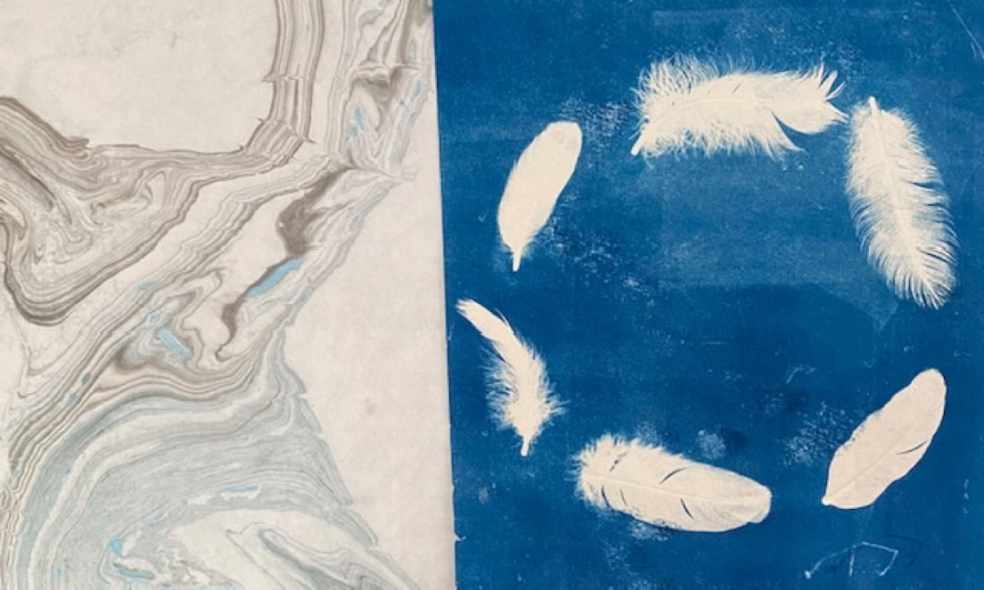Carrie and I had discussed ideas for pieces we were playing around with, one being a series of aerial landscapes, a view from flying over different parts of the world. I pulled a few sheets of marbled paper and feather prints from her progress work table. The marbled paper looked like the mesas and water channels of the Southwestern US. I started drawing in the white space on the paper without a plan for a finished piece. I just started drawing, added color with pencil, then added feather prints to the tops of what looked like mesas. No plan. I just enjoyed the act of creating. I eventually added some paint to the finished piece, and in the end, it may resemble a bit of Carrie's work, mine, or something else entirely. The finished look of the artwork may not be the most important outcome. Through this process, I've understood that making and sharing, not being hindered by trying new things, is the heart of collaborating with Carrie.