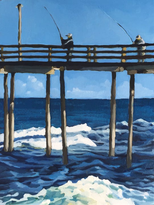 Two Fisherman Avon Pier (2016), oil on board, 5x7 in SOLD