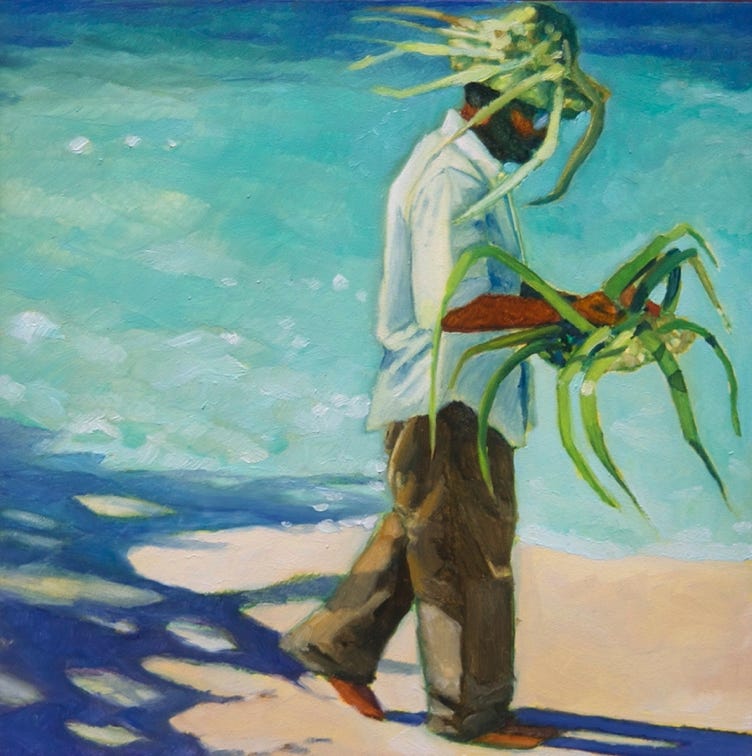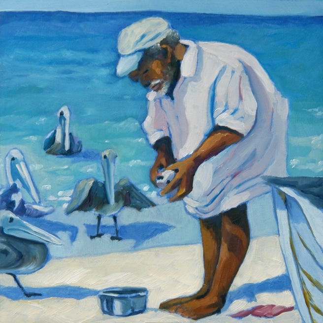 Cayos Cochinos Fisherman with Pelicans (2014), oil on board, 6x6 in SOLD